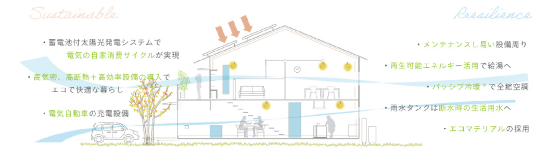 高断熱、高気密、高効率設備の導入により実現する地球にも私たちにもやさしい暮らしです。